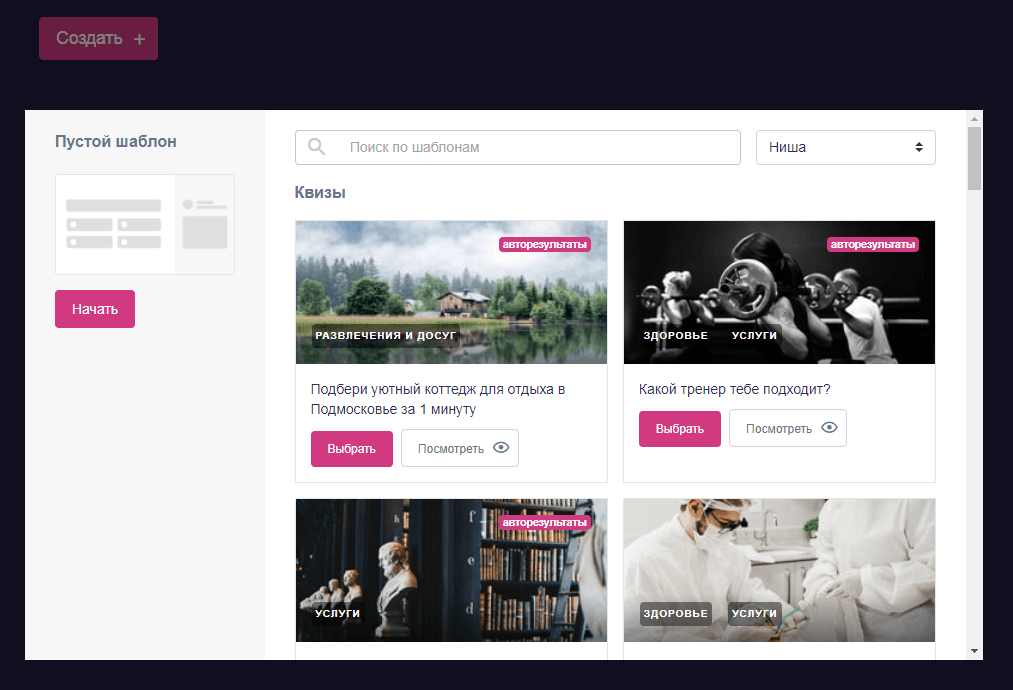 Шаг 2. Выберите шаблон. В базе конструктора — более 100 готовых шаблонов, в которые можно вносить правки. Это удобно для новичков, потому что вы сможете создать любой квиз за короткий срок — достаточно только изменить картинку на стартовой странице или переписать вопросы. Так легче разобраться в том, как работает конструктор, и научиться делать квизы.