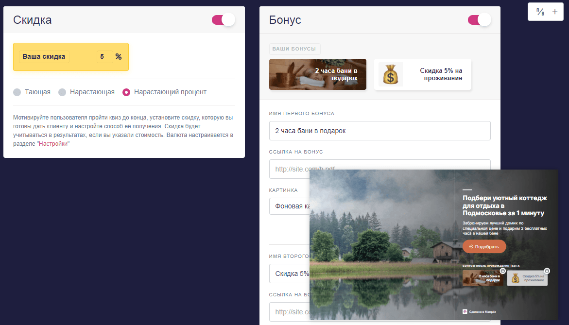 👉** В квиз можно интегрировать скидку или подарок** и показать их клиенту еще до начала теста. Это мотивирует дойти до конца и получить бонусы. У Marquiz есть фишка — динамическая скидка, которая растет в зависимости от количества ответов. Это тоже подогревает интерес потенциального клиента.