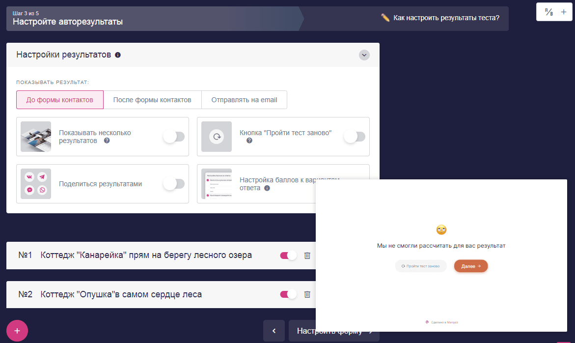Шаг 5. Добавьте результаты — вы можете настроить их сами в зависимости от ответов клиента. Например, квиз помогает выбрать дом для отдыха на выходные. Результат будет зависеть от количества человек, бюджета и места отдыха.
