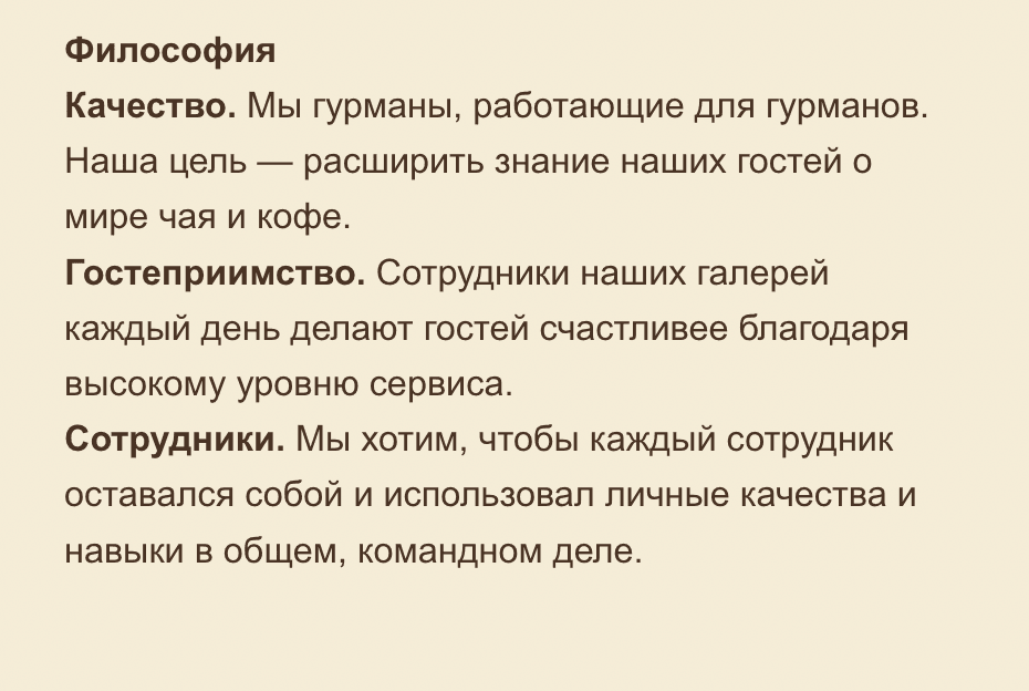 Например, в сетевой компании «Кантата», которая занимается продажей чая, кофе и подарочными десертами, ценности трансформировались в философию