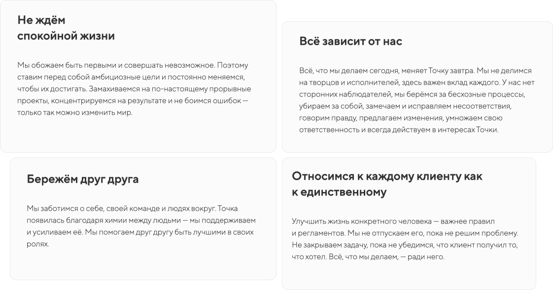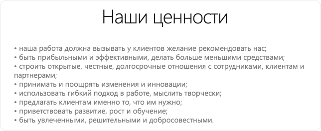 Чтобы все окружающие понимали, что ценно именно для этой компании, принципы оборачивают в буквы, в виде длинного списка, презентации или просто текста из нескольких абзацев.