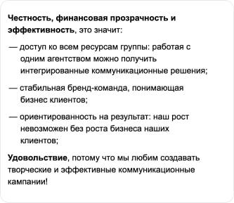 | Клиентоориентированность | Мы работаем после 19:00 и в выходные, если это нужно клиенту |