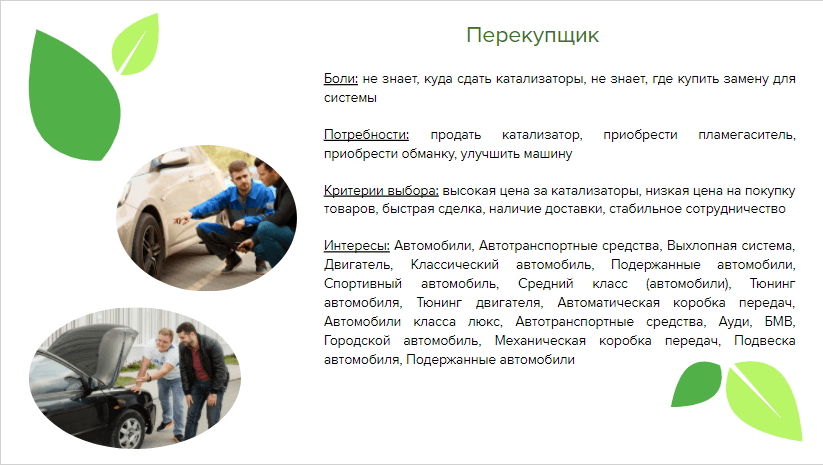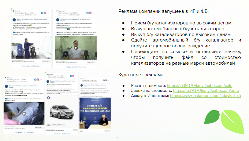Рекламные офферы мы составляли на основе исследования и возможностях заказчика. При этом мы тестировали два направления - скупка автокатализаторов и продажа пламегасителей.