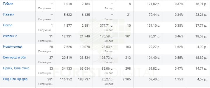 За следующие два месяца работы мы постепенно добавляли и меняли города на двух площадках , стараясь удерживать минимальную цену заявки. Если сравнивать с нашим первым подходом, то мы хоть и получали много заявок по 25 рублей, но они шли из объединенной кампании нескольких регионов. Теперь же мы получали уже равномерно заявки по всем городам, и их стоимость не превышала 150 рублей. Так что не зря мы тестировали ВКонтакте - это позволило нам прийти к выводу, что для каждого города есть своя более эффективная для продвижения социальная сеть.