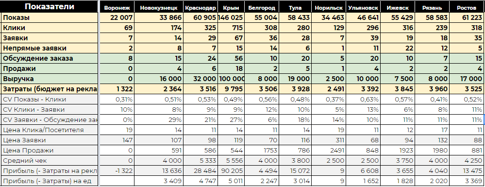 Наращивая постепенно обороты по рекламного бюджету и количеству городов, мы готовились к более серьезному масштабированию, но выявились проблемы, из-за которых нам пришлось остановить работу. Внушительный объём входящих заявок на 20+ городов означал и большую работу с обработкой заказов и контролем за качеством продаж. Собственно, здесь и нашлись болевые точки у заказчика, которые не позволили продолжить масштабирование. Поэтому было принято решение приостановить сотрудничество, чтобы за это время выстроить внутренние бизнес-процессы, которые позволили бы увеличить прибыльность проекта.