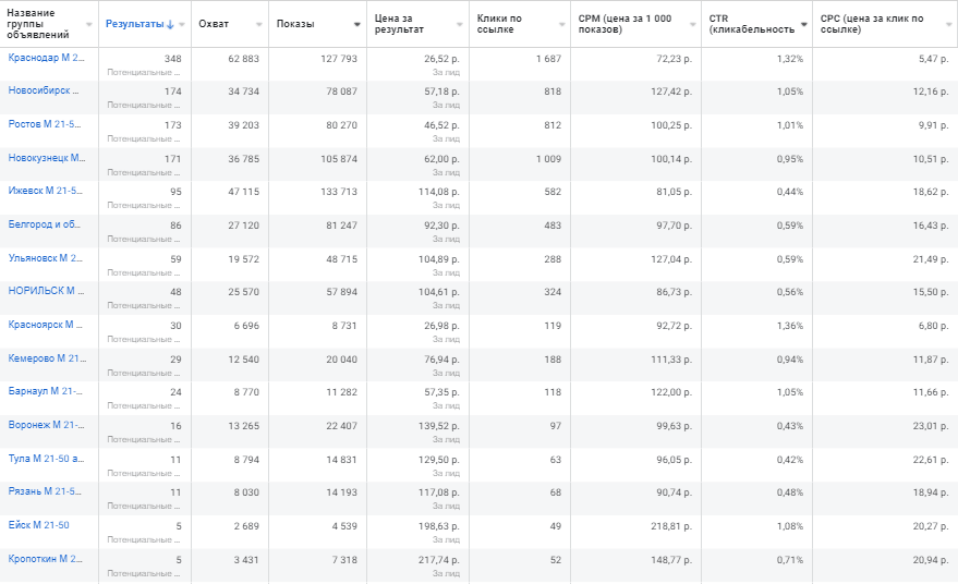 В Facebook мы решили сделать уже отдельные кампании под каждый город, так как в первый раз не по всем регионам удалось достичь равномерного получения заявок. После первый дней работы стоимость заявки стала оптимизироваться и возвращаться к первоначальным значениям. Однако, не все регионы давали хороший результат. Т а к, например реклама для Ульяновска, Рязани и Тулы, работала намного хуже, чем по результатам работы во ВКонтакте. Поэтому было принято решение перенести обратно на данную площадку описанные выше регионы. И это дало свои результаты - стоимость лида снизилась вдвое.