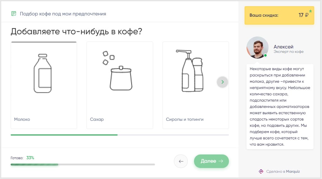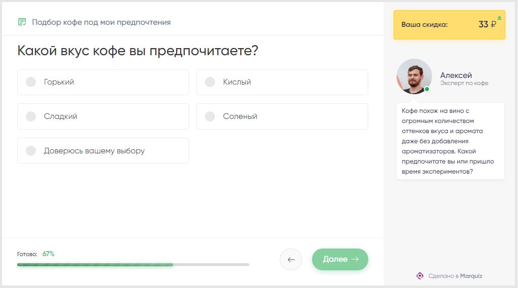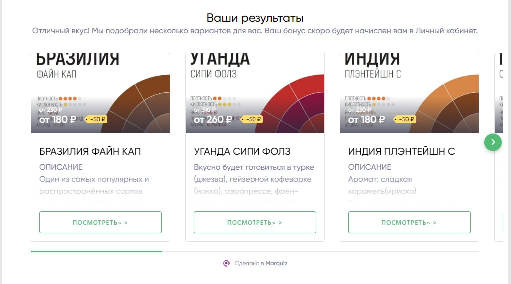 Используйте авторезультаты в настройках Marquiz. Например, в Coffee Project сразу показывают подборку кофе из каталога на основе ответов пользователя. Не забудьте подключить интеграцию с CRM — и всё будет проводиться удобно и автоматически.
