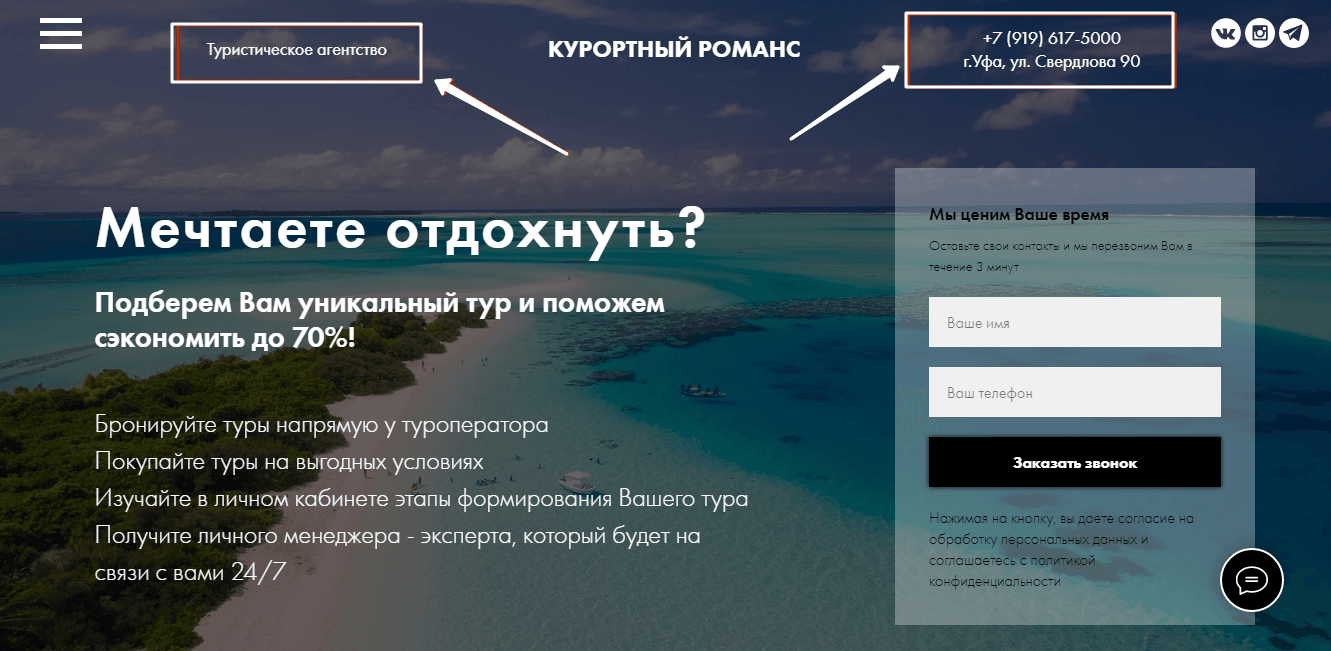 Взглянув на сайт, Алексей понял, что дешевых заявок ждать не стоит. В первом блоке не было даже адреса и телефона. Непонятно было, что это за «Курортный Романс», а название может говорить о многом, тем более когда у вас турагентство. Рекомендации Алексея оперативно внедрили.
