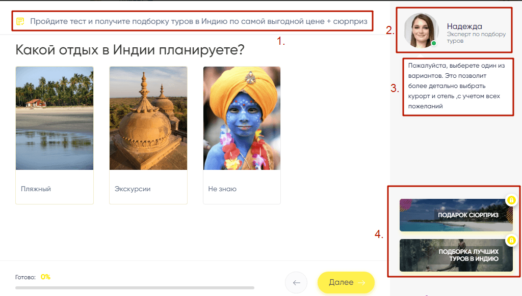 Пример квиза Алексей составил сам, а остальные были сделаны по его образу и подобию. Квиз можно увидеть на странице турагентства. После прохождения квиза, пожалуйста, НЕ ВВОДИТЕ в него контакты, так как заявка будет засчитана системой, и с клиента спишут деньги.