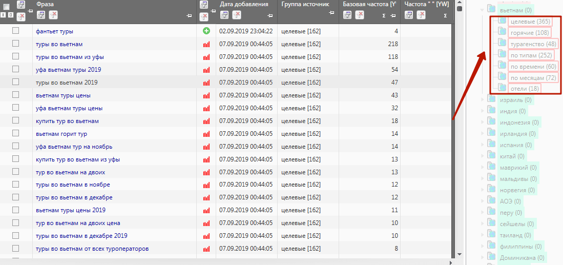 Алексей собрал семантику сразу на 20+ направлений (чуть дальше вы узнаете, по какой причине). Сделал кластеризацию на этапе сбора масок (базовой семантики) для упрощения работы с семантикой на дальнейших этапах. Алексей любит заранее разбивать семантику по направлениям (чтобы потом не утруждаться с кластеризацией), и в таких случаях он рекомендует сделать разбивку по: