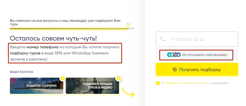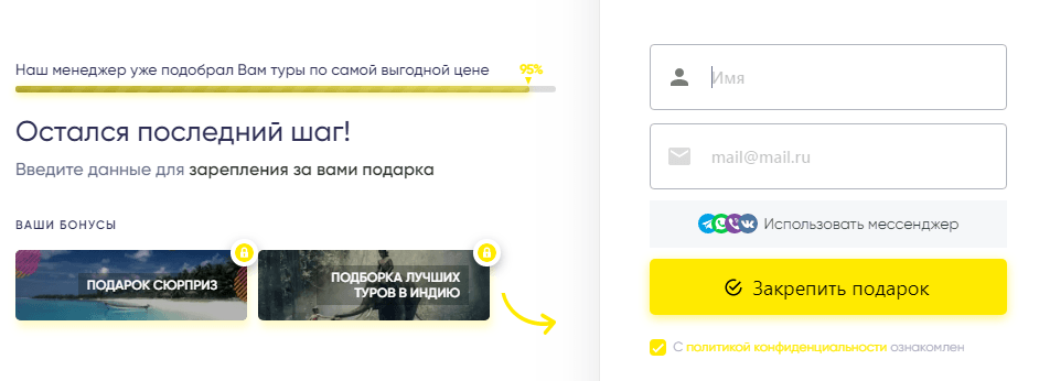 На сайте не было модулей выбора туров. Не было даже примеров туров с ценами. Просто форма захвата с предложением оставить контакты и не терять время.