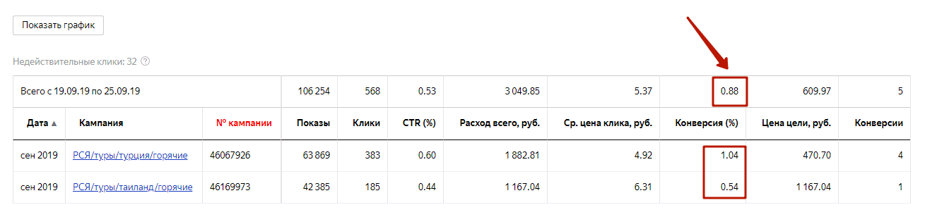 Для теста было создано 2 кампании в РСЯ по направлениям Турция и Таиланд.