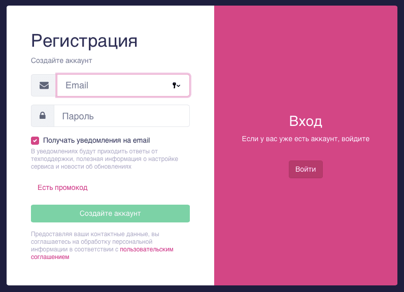 - Открываю бесплатный аккаунт в сервисe все стандартно: емейл + пароль