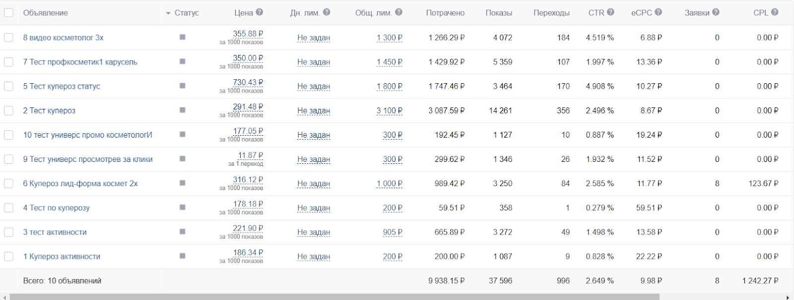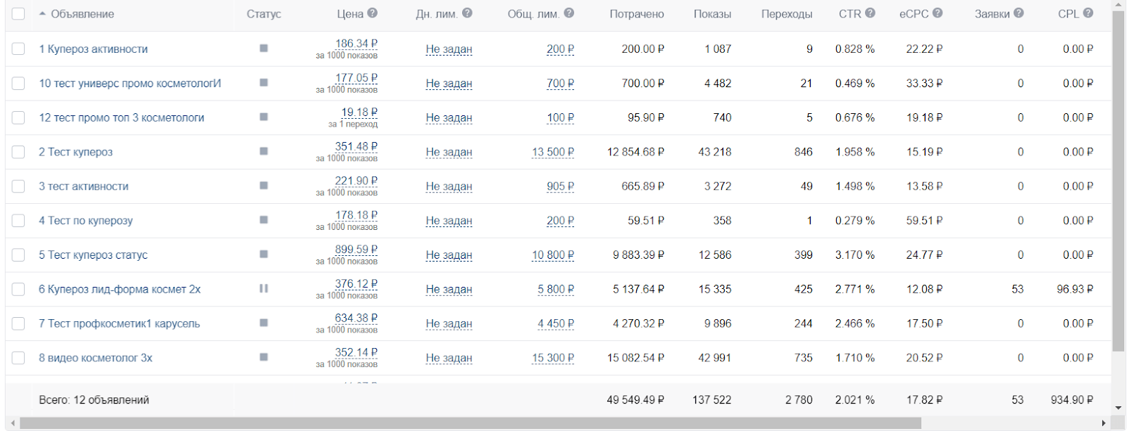 Поставленная задача выполнена. Цена лида ниже предельно допустимой в 3 раза. Заканчивали рекламную кампанию, когда была объявлена самоизоляция. Рекламу остановили до того момента, когда откроется производство и косметологи начнут оказывать свои услуги.