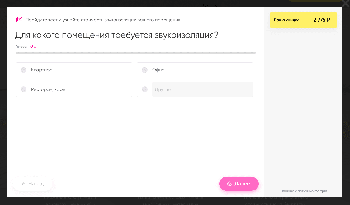 Квиз-лендинг. Сделали максимально просто: один экран с предложением посетителю пройти тест из четырех вопросов, чтобы узнать стоимость звукоизоляции. Посетитель не отвлекается на чтение других экранов, поэтому конверсия в заявку должна быть высокой. Посмотрим, какой она окажется на самом деле.