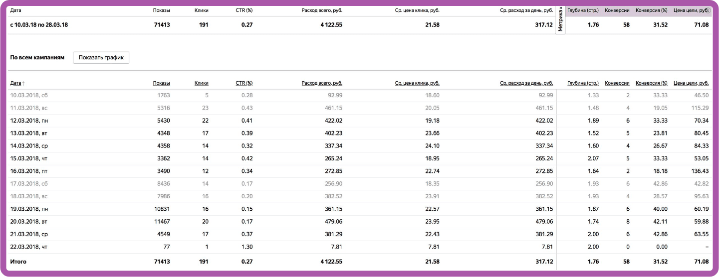 Некоторые показатели на скриншоте могут быть неточными. Возможно, это связано с трудностями при переносе кампаний в другой аккаунт. Основное, на что обратить внимание — это цена клика в 21 ₽ и стоимость прохождения цели всего в 140 рублей.