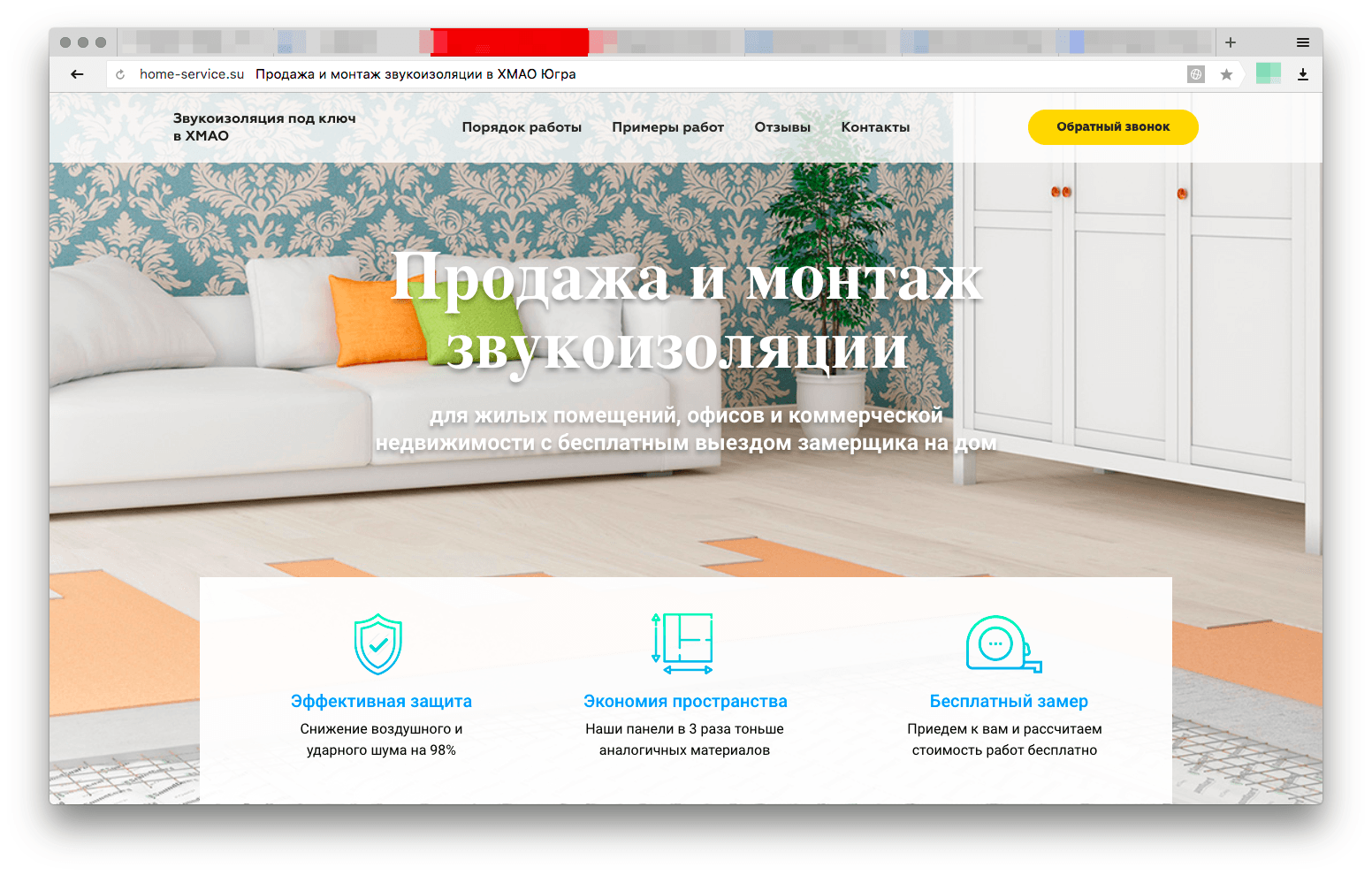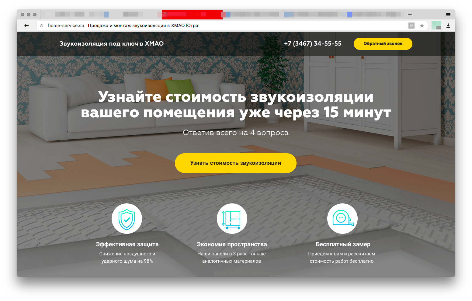 Лендинг. Сделали лендинг из 8 экранов: пользователь постепенно узнавал о преимуществах, смотрел примеры, читал отзывы тех, кто уже делал звукоизоляцию у компании.