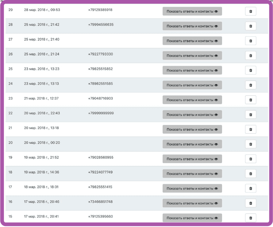 Все заявки вместе с ответами на вопросы и телефоном видно в личном кабинете. Сами ответы — это вводная информация для менеджера, которому теперь легче общаться с потенциальным клиентом.