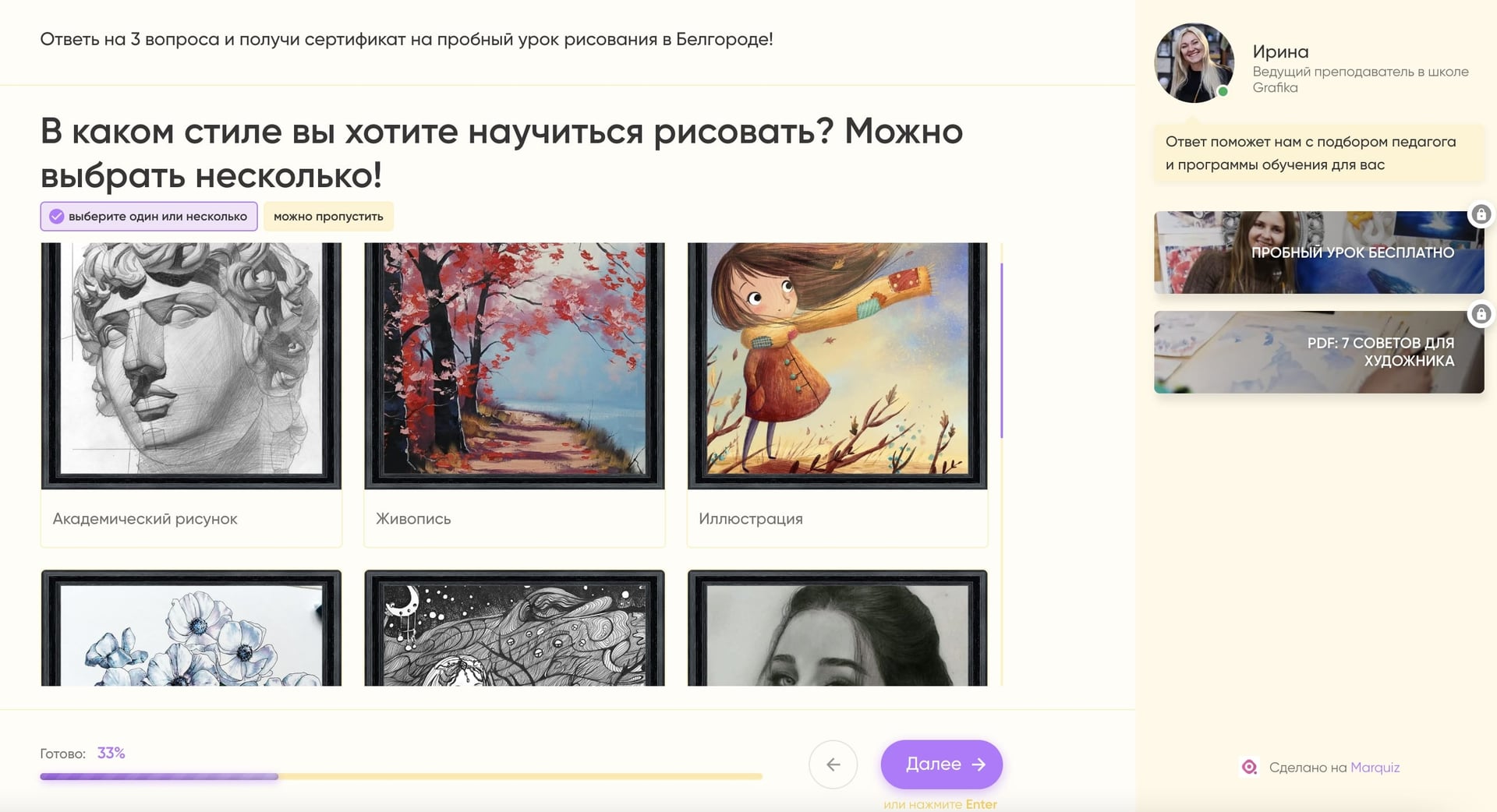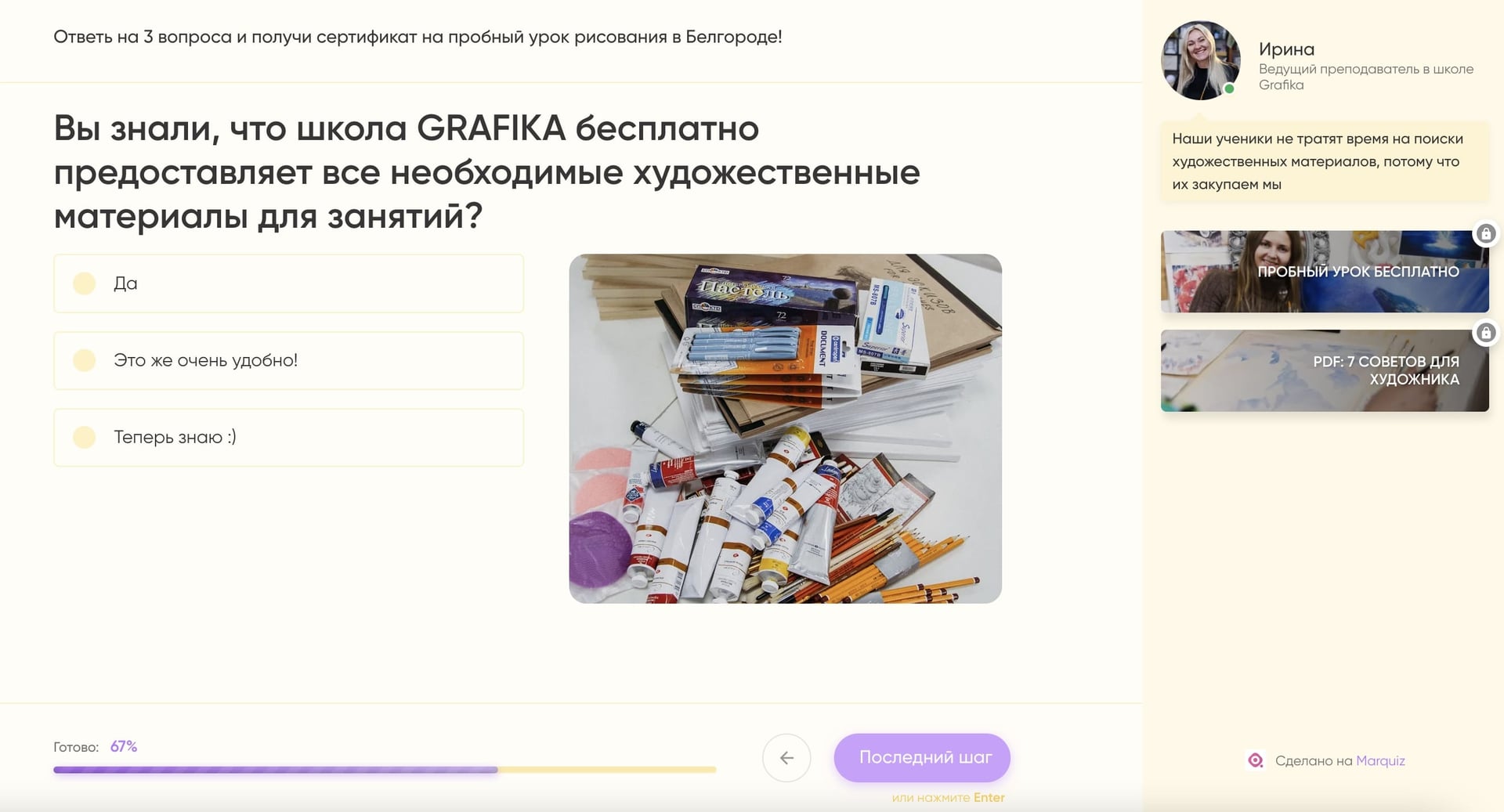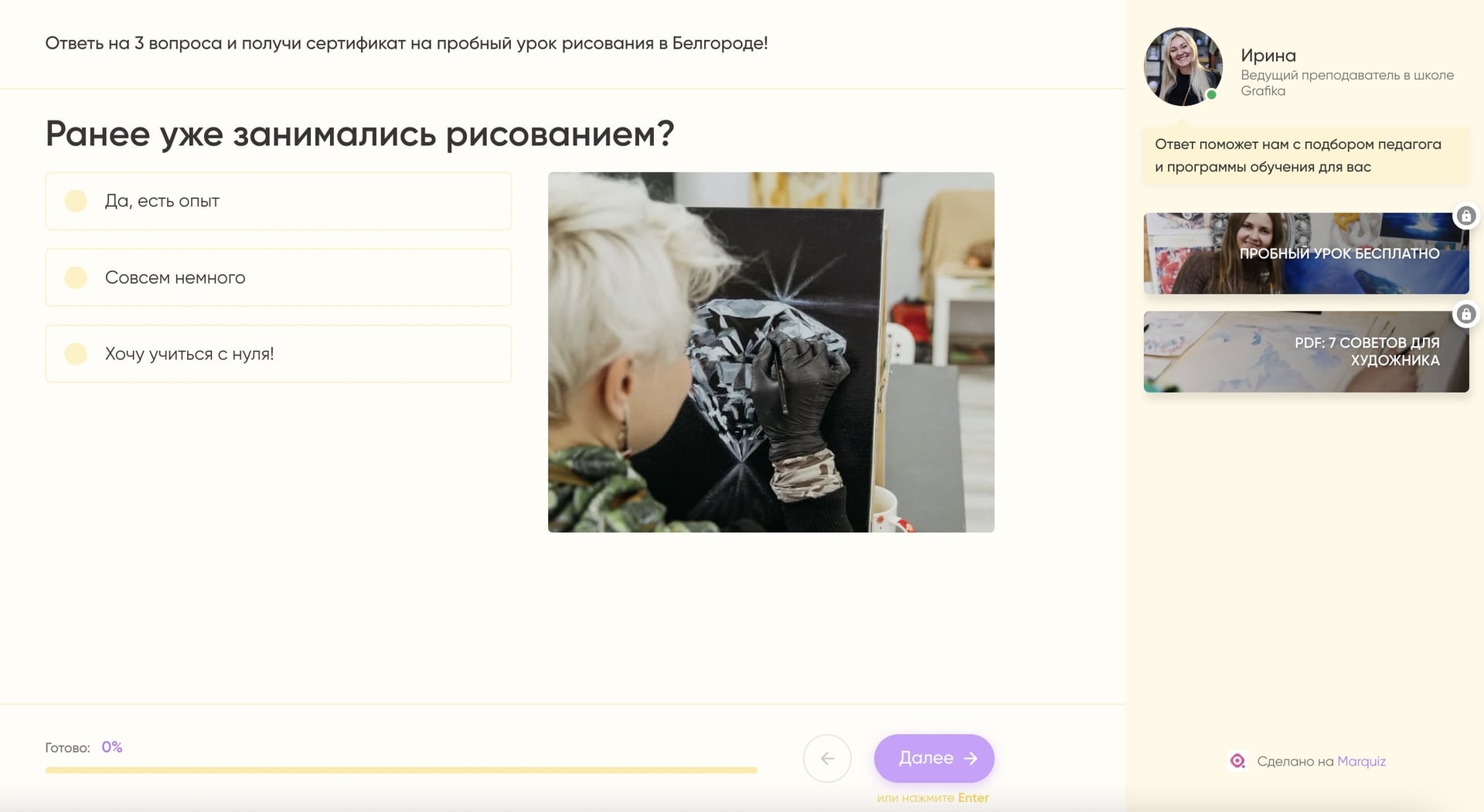 Всем привет 👋, на связи Марквиз. Сегодня расскажем про продвижение школы рисования в Белгороде и как с помощью квиза удалось привлечь 305 заявок с конверсией в приход от 42 до 50%. и поднять общую конверсию в заявки в среднем на 27%.