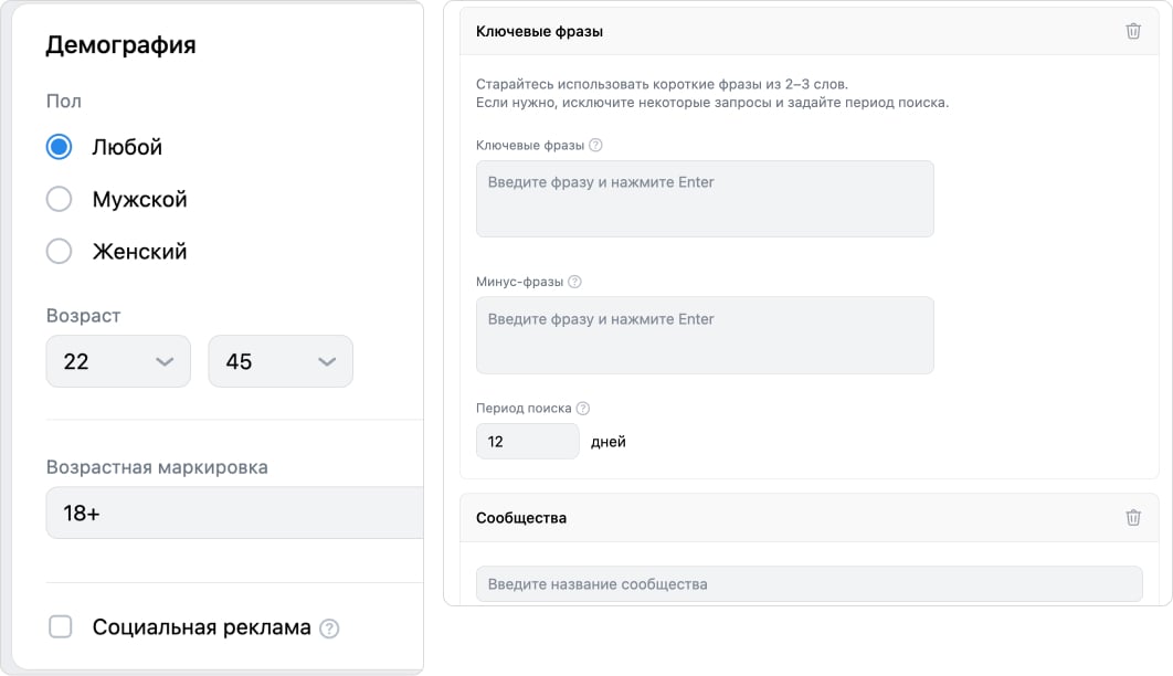 Фильтруем целевую аудиторию по полу, возрасту, персональным интересам, активности в социальной сети и другим личным параметрам.