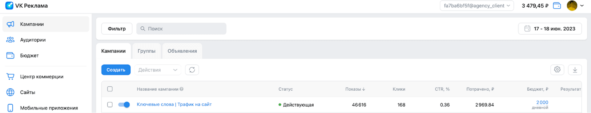 И вот, кампания успешно откручивается, работа кипит. В новом ВК Реклама смотрим всё ту же статистику по метрикам. По сравнению со старым ВК, в новом VK Ads практически ничего не поменялось с точки зрения статистики и аналитики: стало больше метрик на уровне кампании, чуть удобнее настройки и безусловно, симпатичнее с точки зрения интерфейса.
