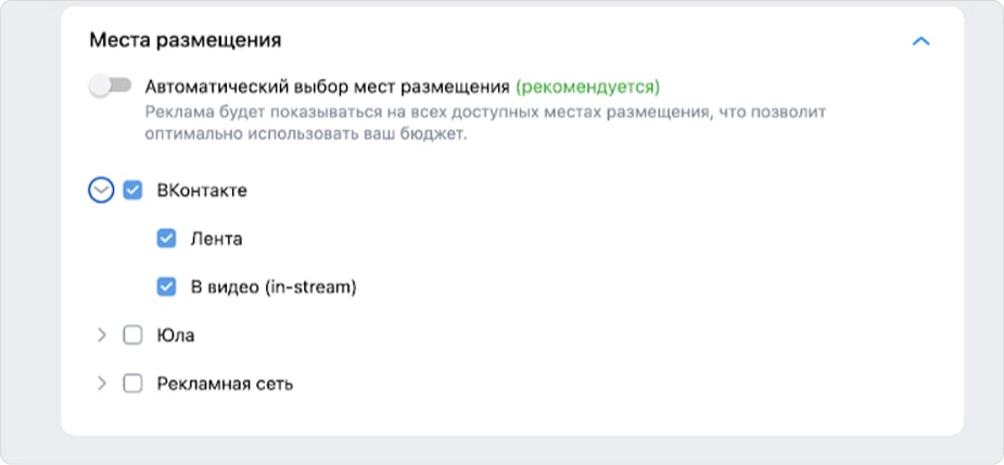 Выбираем места, где будет показываться реклама: новостная лента, сообщения, рекламные площадки на сайте ВКонтакте и другие.