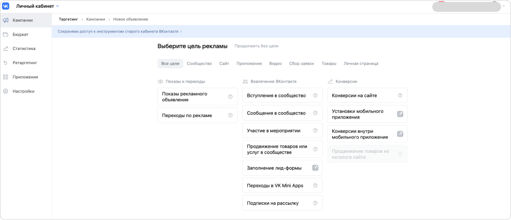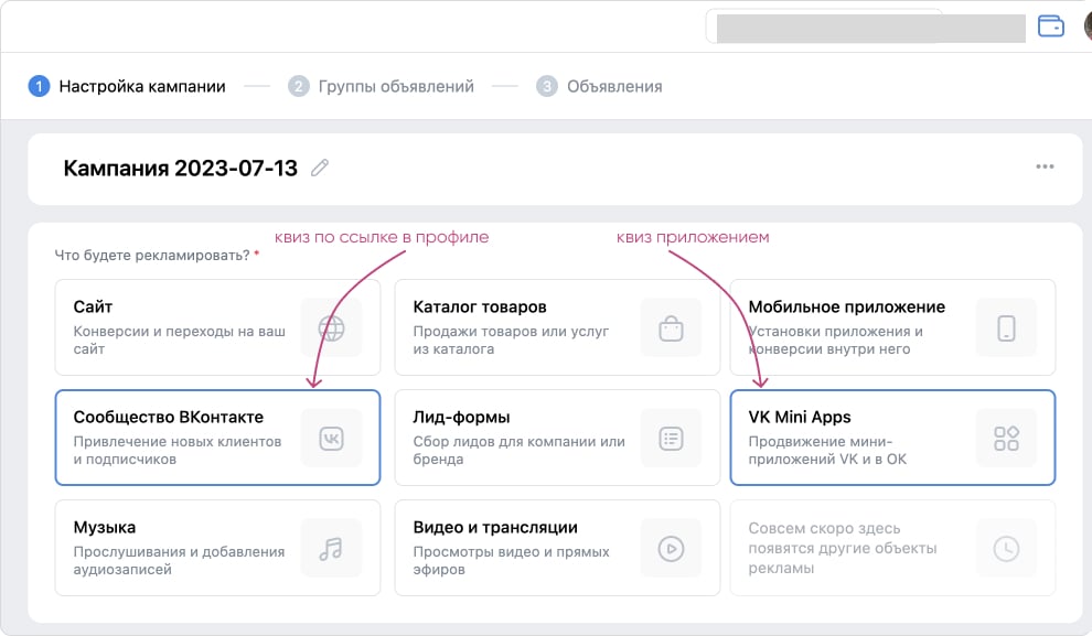 В старом кабинете ВК всё начиналось с целей кампании, а в новом мы сначала определяемся с объектом рекламы, а потом уже прорабатываем детали.