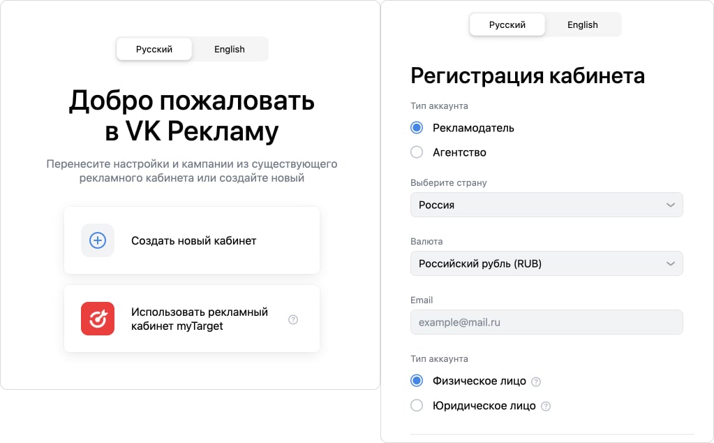 До того как запускать кампании, нужно обязательно прописать в настройках аккаунта имя и юридическую информацию. Так VK сможет автоматически маркировать любые рекламные креативы и не нужно будет беспокоиться, соблюден ли закон о рекламе или нет.