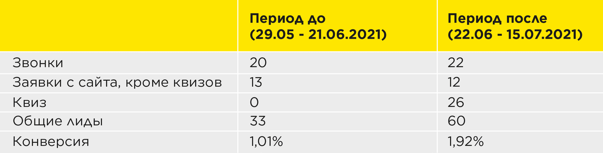 Мы очень часто используем квизы в проектах, потому что инструмент зарекомендовал себя на сотнях проектов, поэтому решили его использовать для увеличения лидов. Наша команда изначально работала с каналом SEO, устанавливая сооветсвующий KPI - заявки.