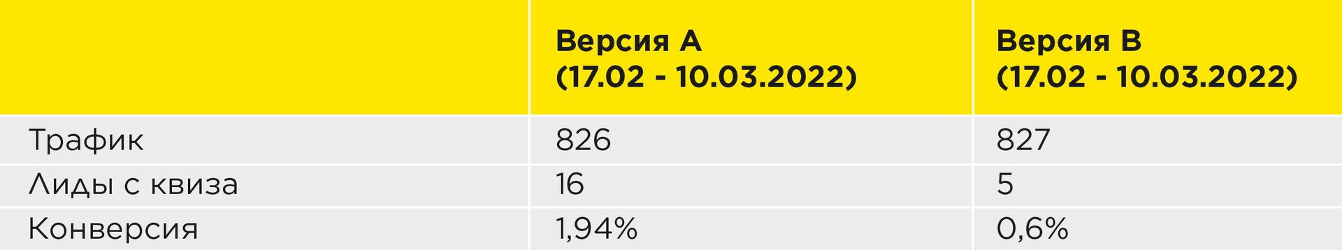 Вывод: все идеи по доработкам нужно тестировать и только после результатов теста внедрять, таким образом снижаются риски провалов. В данном случае удалось избежать серьезной потери лидов, т. к. это был осознанный A/B тест на относительно небольшой выборке аудитории.