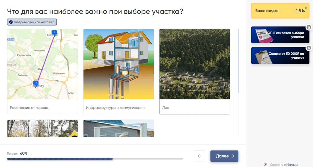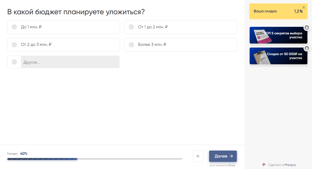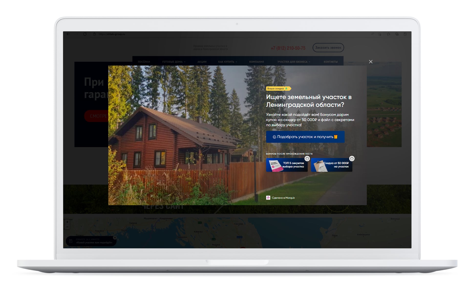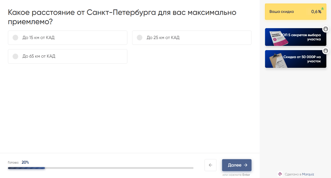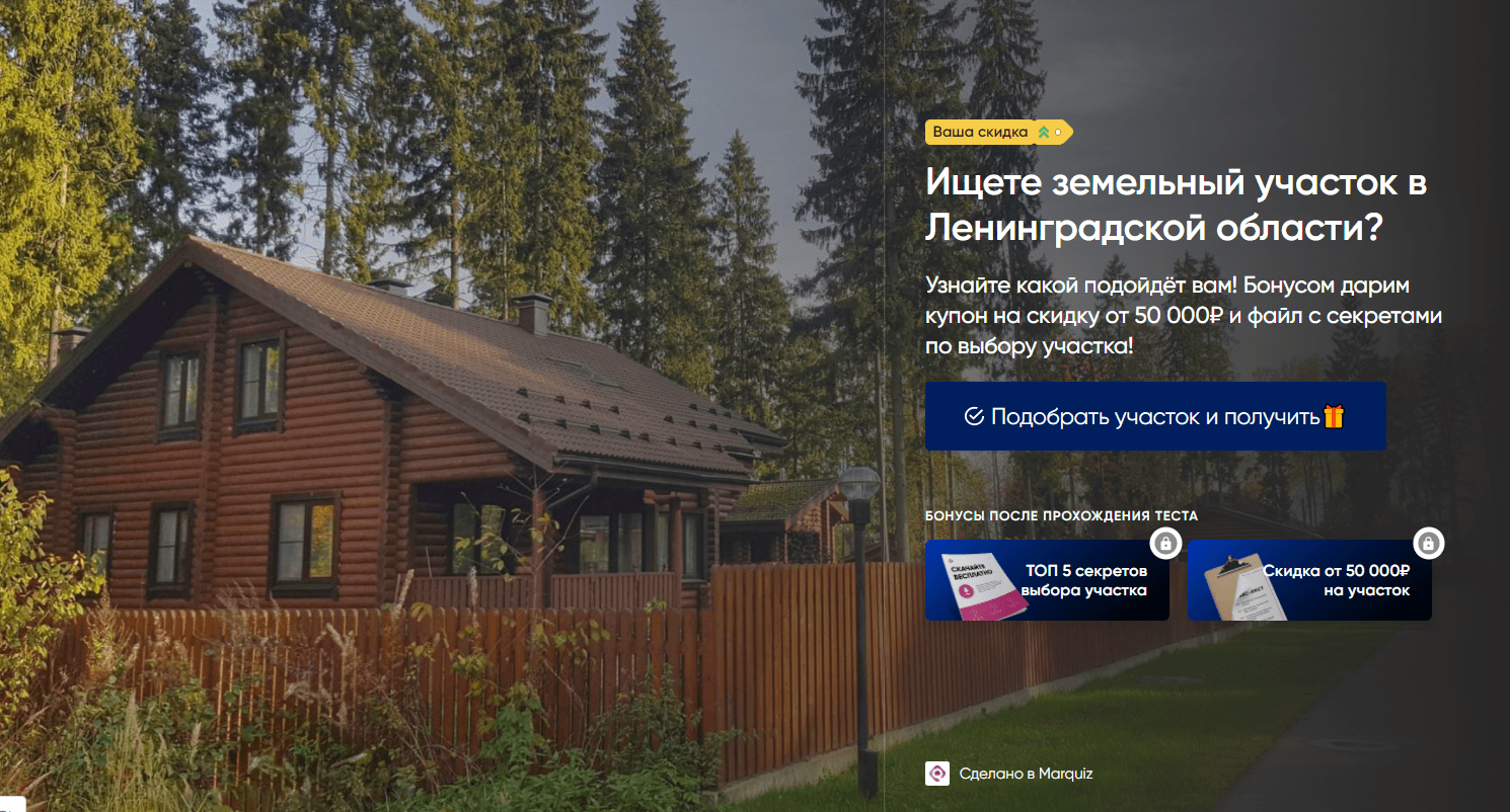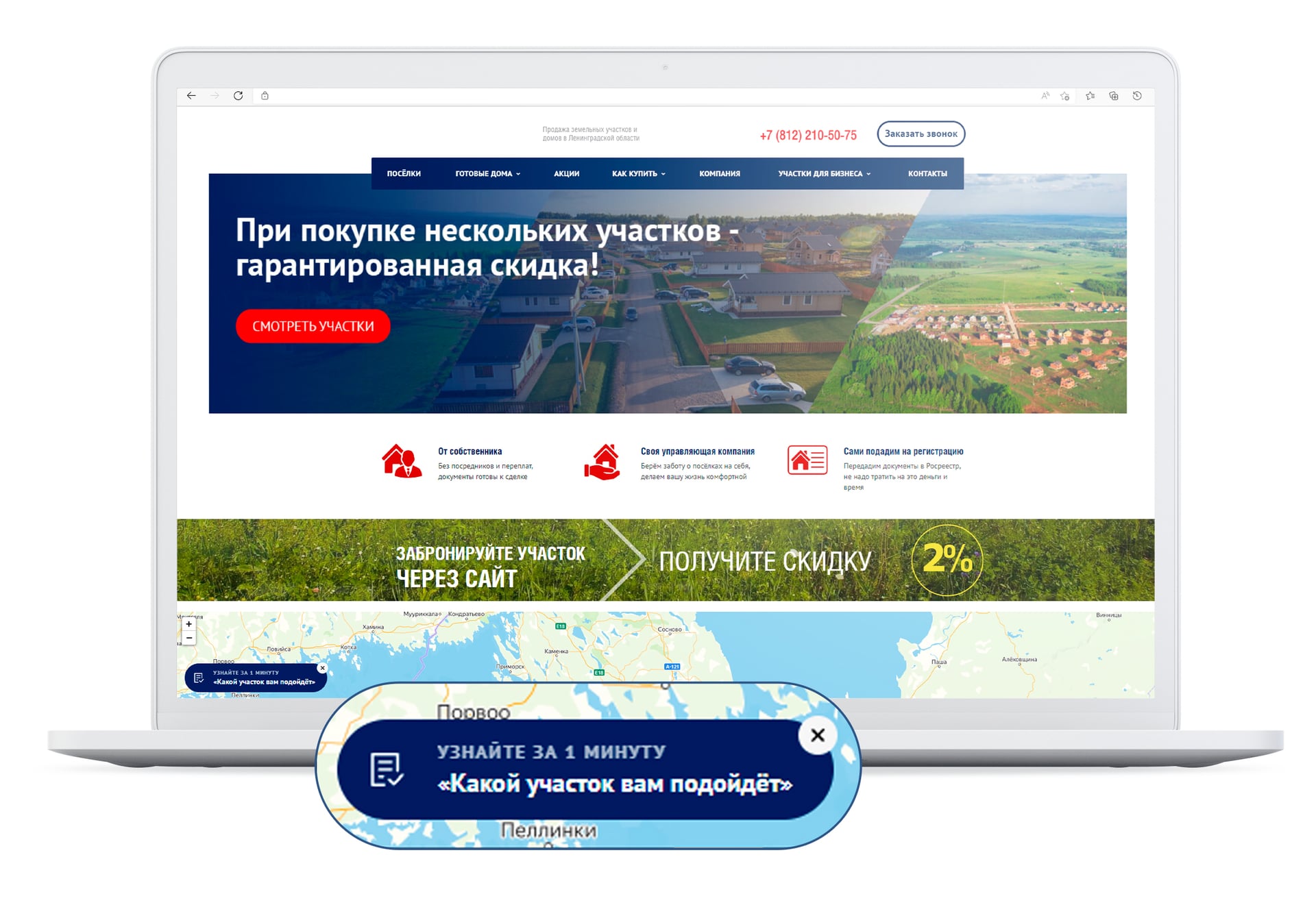 Чтобы увеличить количество лидов, разработали квиз и добавил его на сайт в формате баннера в левом углу страницы с призывом к действию: «Узнайте за 1 минуту какой участок вам подойдет