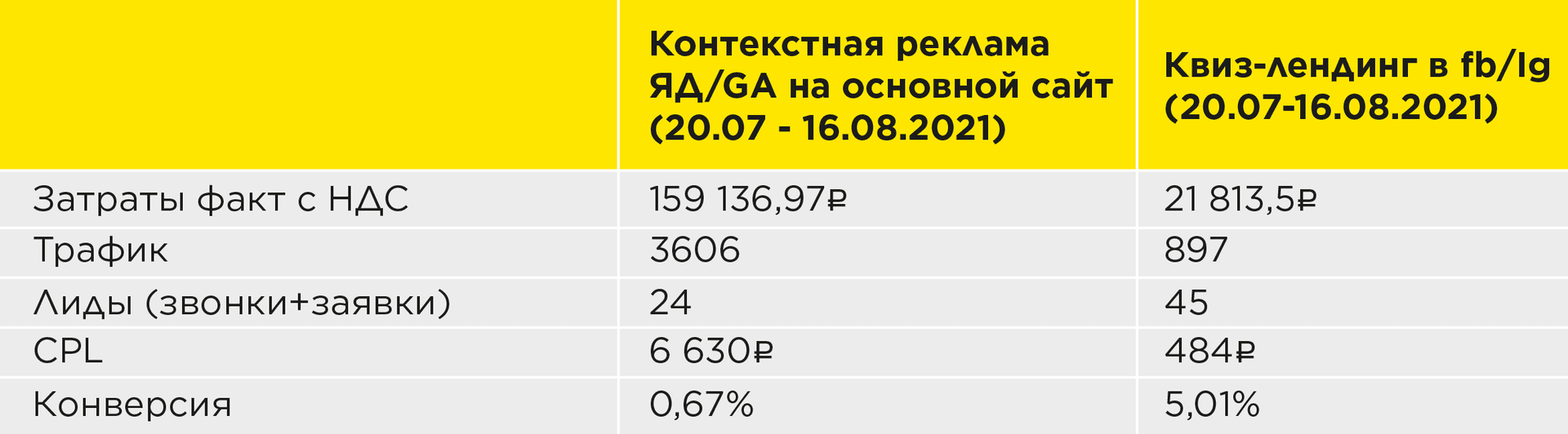 У клиента параллельно была запущена контекстная реклама на сайт. Сравниваем результаты с контекста на сайт и связки FB/IG + квиз-лэндинг: