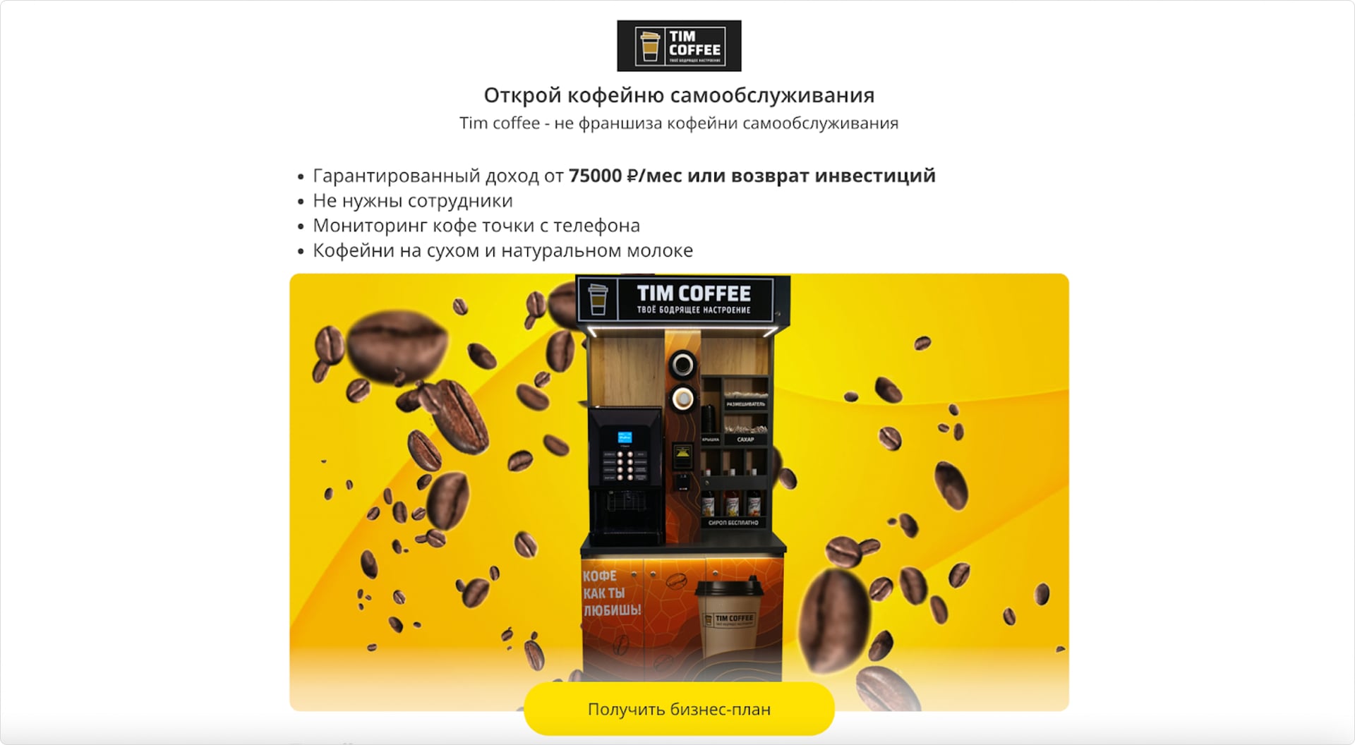 У компании TIM COFFEE работает основной сайт https://timcoffee.ru, там рассказано про преимущества продукта и есть калькулятор для расчёта. Клиент пришёл к нам с запросом на продвижение, так как текущий сайт конвертил слабо.