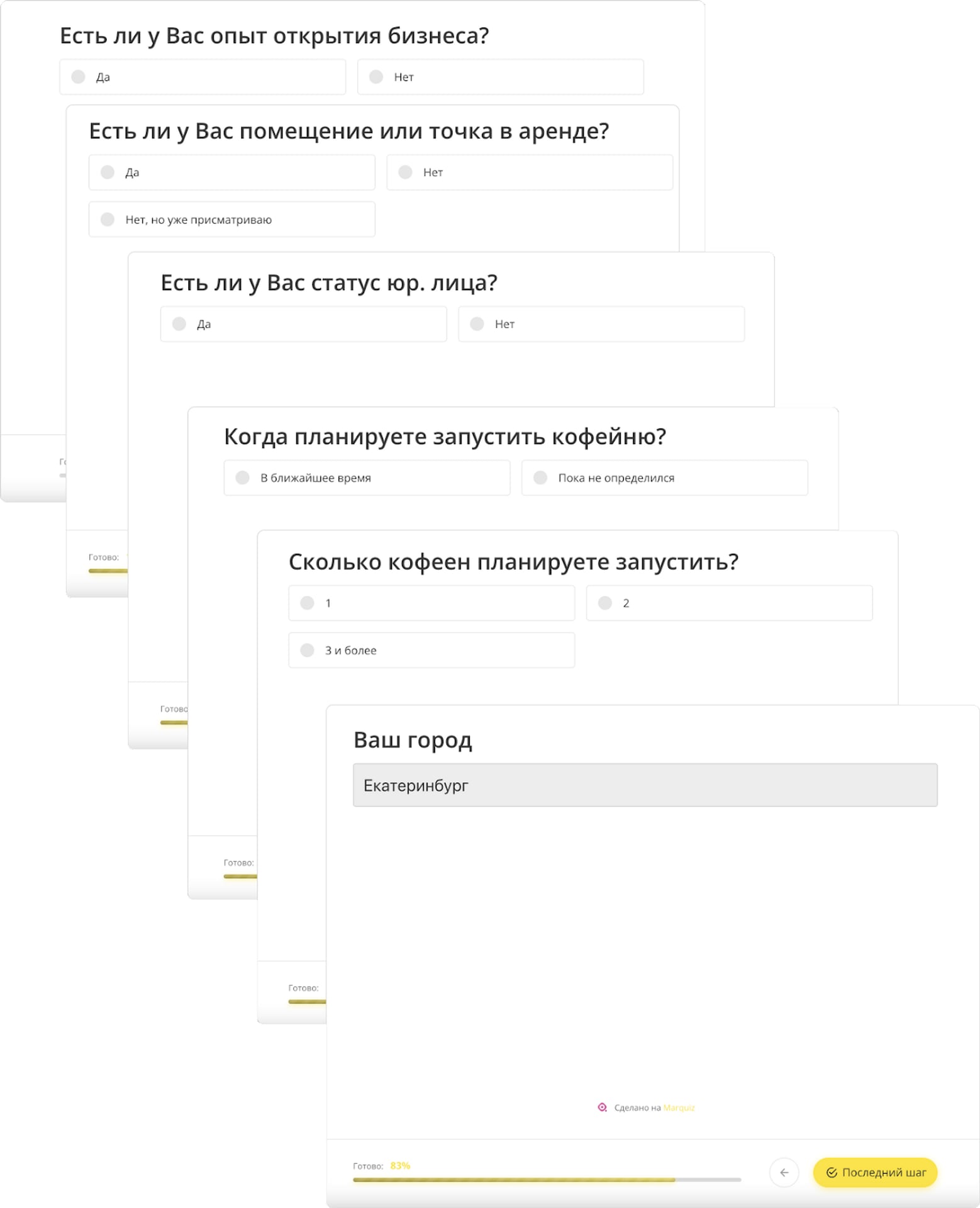 Мы поставили 6 вопросов, которые важны для расчёта бизнес-плана. Это стандартный блок вопросов. Так менеджеру приходили готовые данные для расчёта.