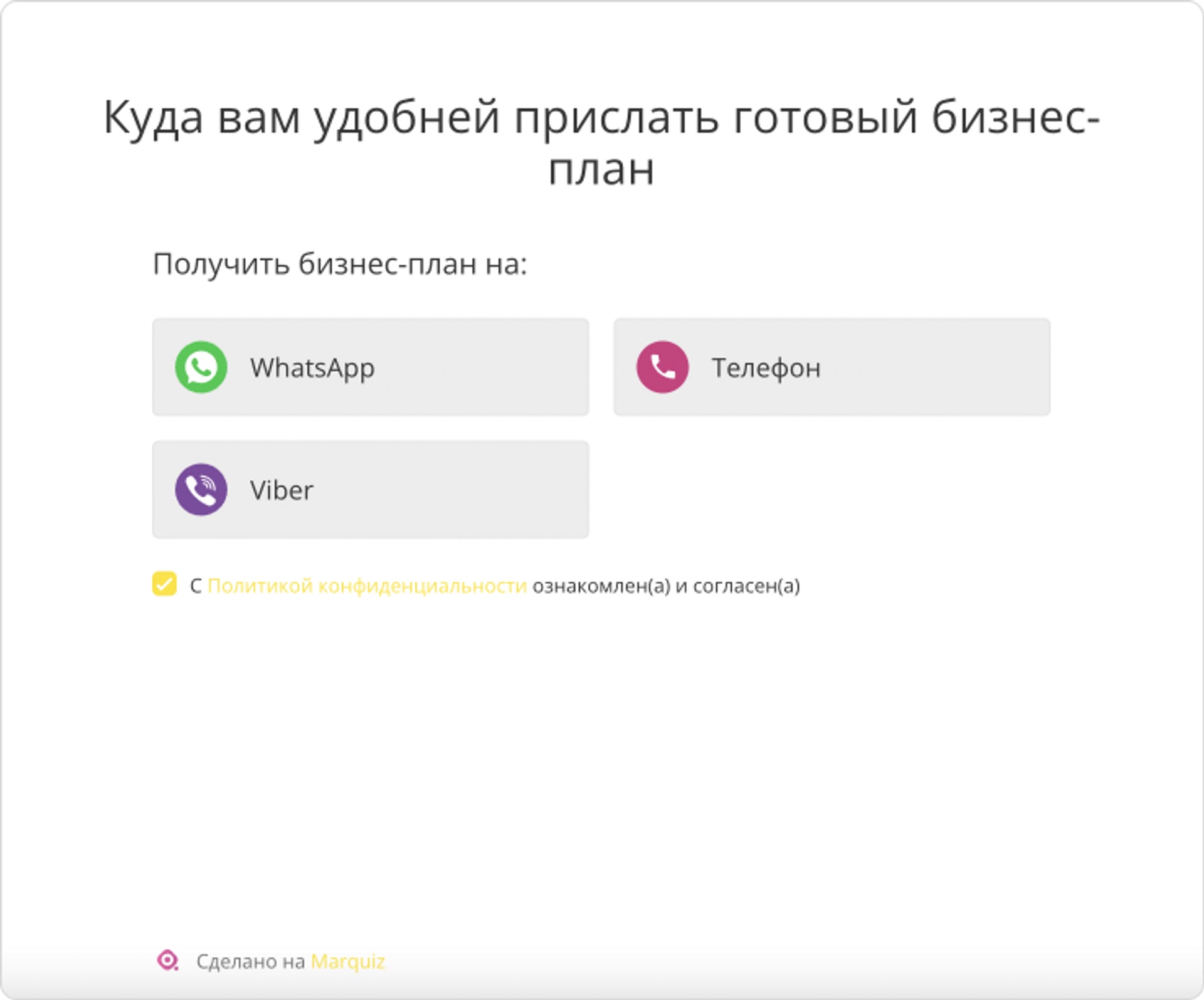 Важно, что мы не просили телефон или email, а мессенджер. Так удобнее уточнить, если чего-то не хватает для расчёта бизнес-плана, и потенциальному клиенту меньше беспокойства звонком и общение происходит более оперативно, чем по почте.