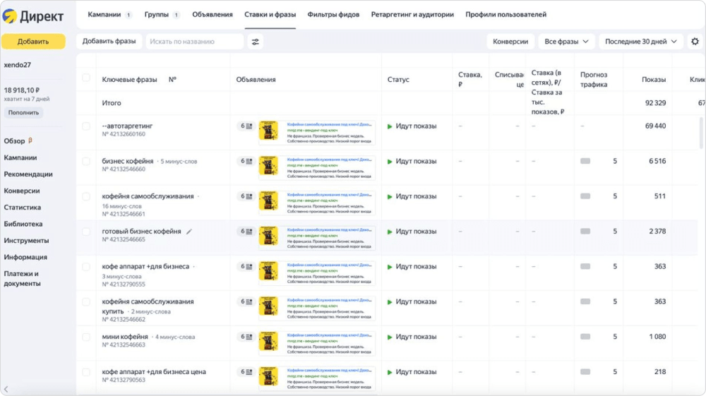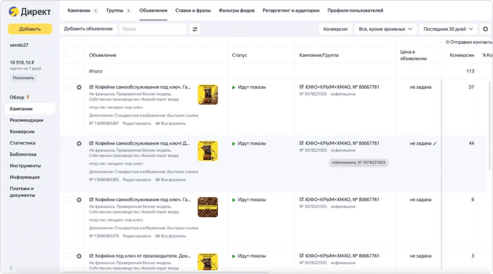 Примеры креативов на РСЯ — всё вокруг кофе, кофейни самообслуживания и бизнеса: