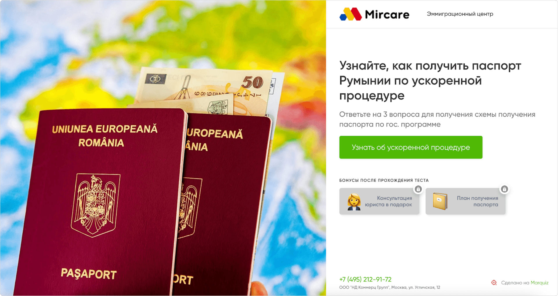 В 2022 году я запускала для заказчика классический квиз со стартовой страницей для оформления вида на жительство ЕС через Румынию. Получили с квиза за месяц 44 заявки, конверсия квиза из открытия в заявку составила 3,4%.