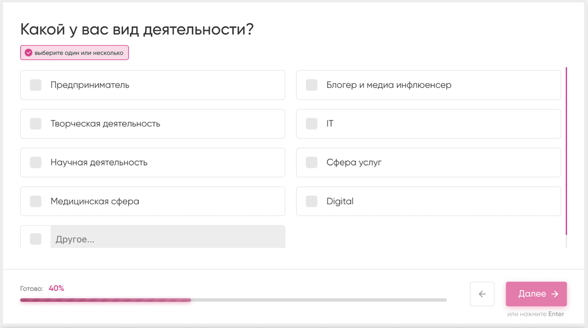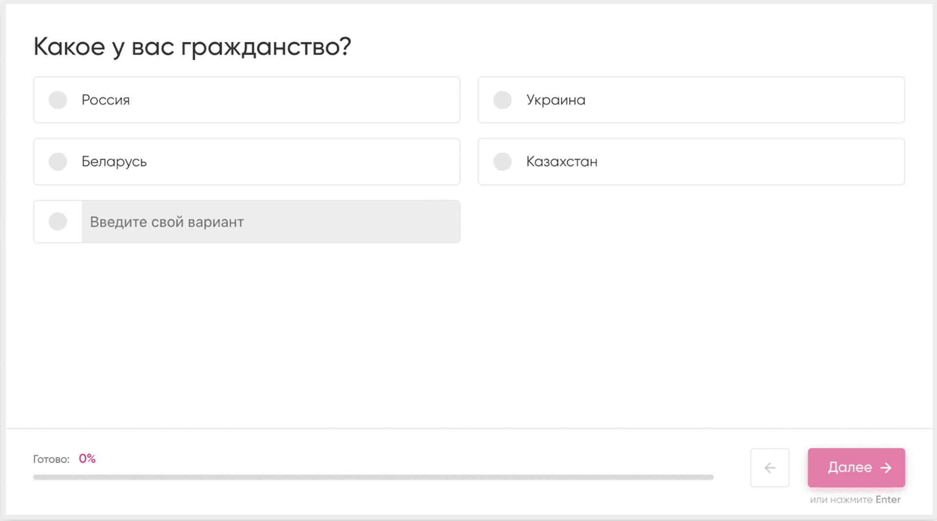 Я добавила общие вопросы — гражданство, возраст, вид деятельности, чтобы помочь отделу продаж отсеять нецелевых клиентов.