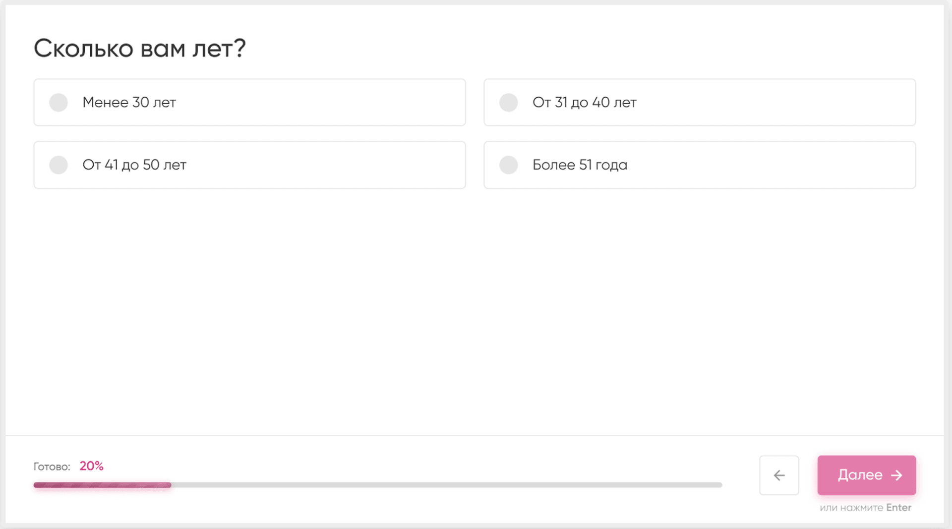 Уже до квиза посетитель прогрет, он понимает преимущества и возможности, увидел свою боль и способ, как мы можем её решить. Поэтому следующий этап воронки, квиз, становится естественным продолжением пути пользователя.