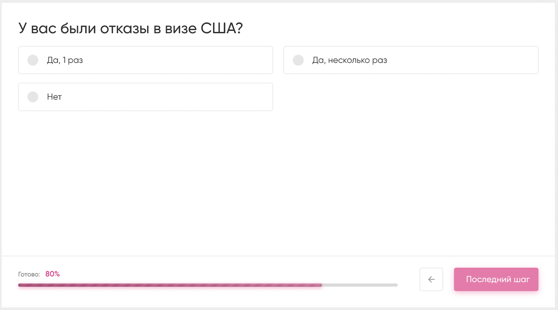 Когда мы вели трафик на получение паспорта ЕС (трафик на квиз со стартовой страницей), получили 44 заявки за 160 рублей. Конверсия квиза 3,4%.