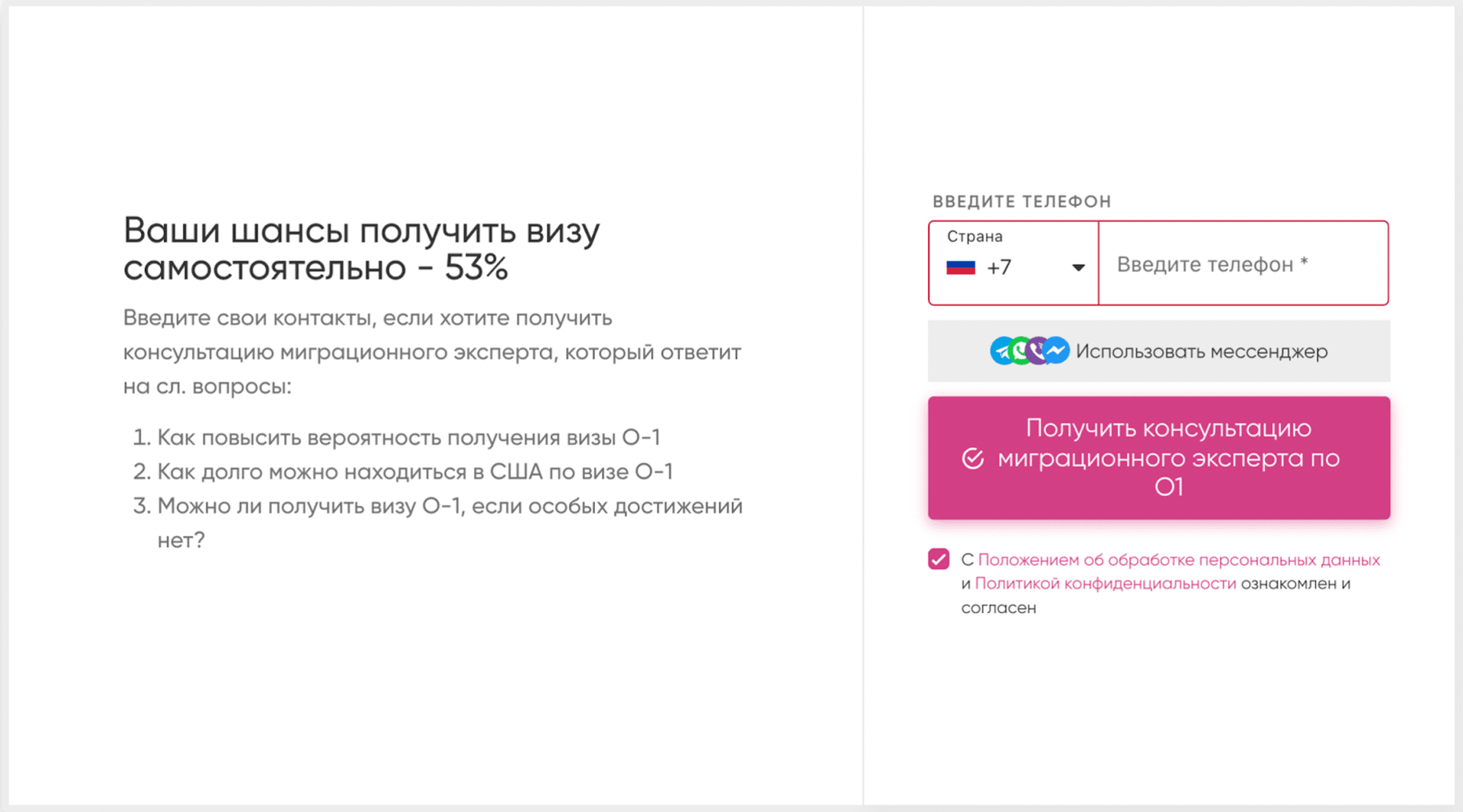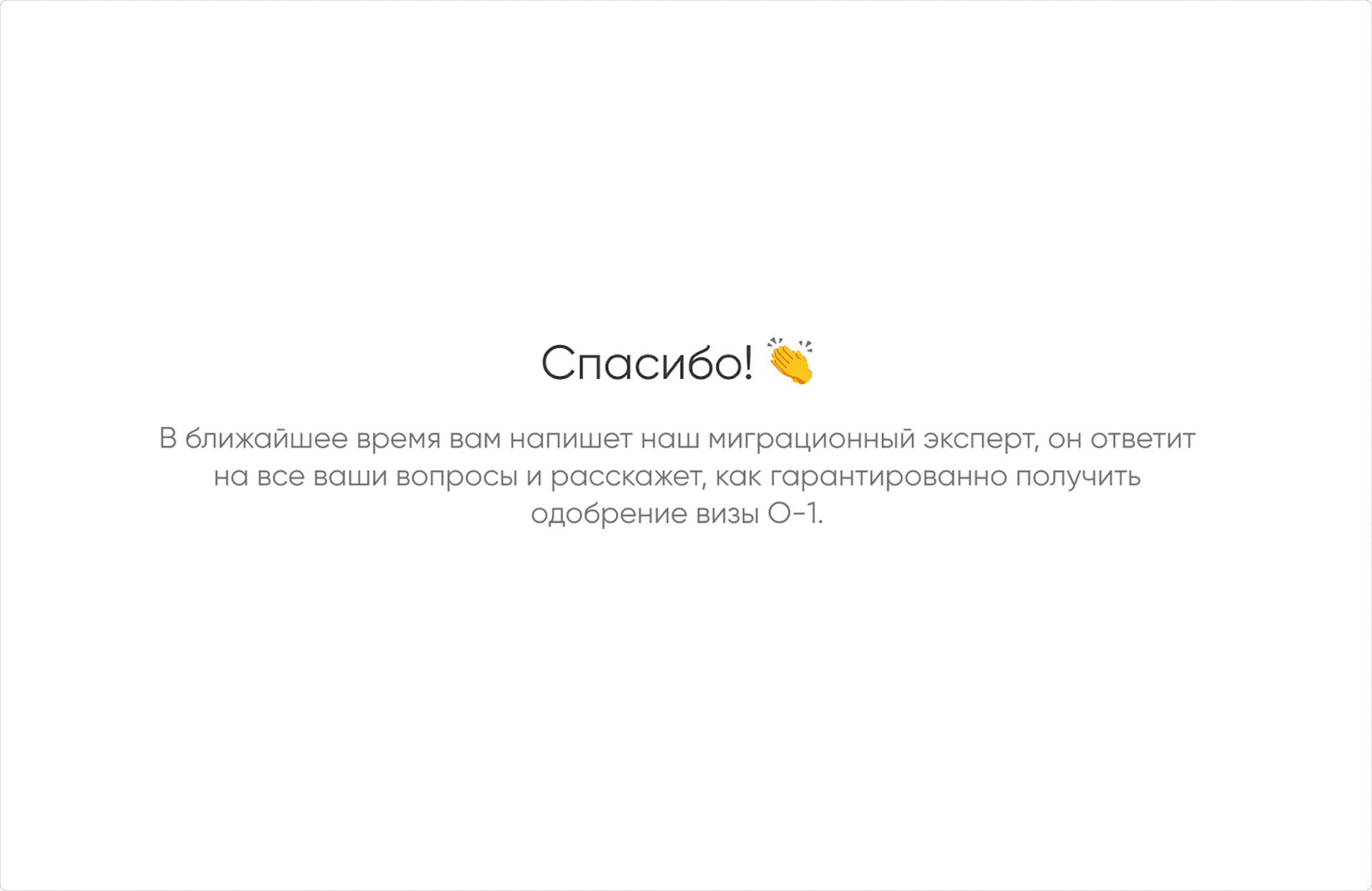 Здесь было важно дать больше информации пользователям перед прохождением квиза: показать готовые кейсы настоящих людей, которым удалось получить визу О–1, рассказать немного о преимуществах компании и самой визы. Только самое необходимое для первого знакомства.