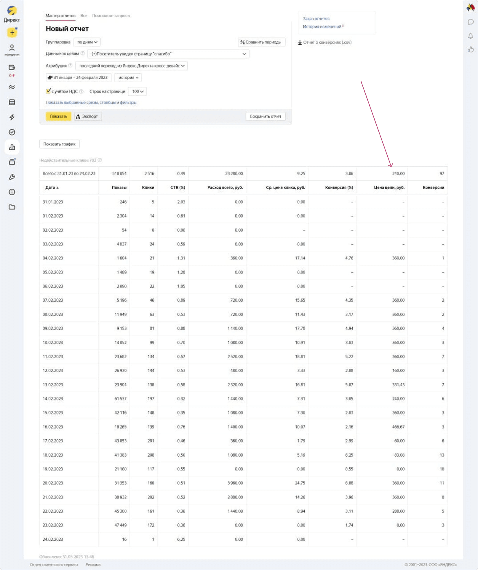 Одно из целевых действий — посетитель должен увидеть страницу «Спасибо», то есть пройти квиз до конца и оставить заявку. Средняя стоимость СРА в феврале — получилась 240 рублей.