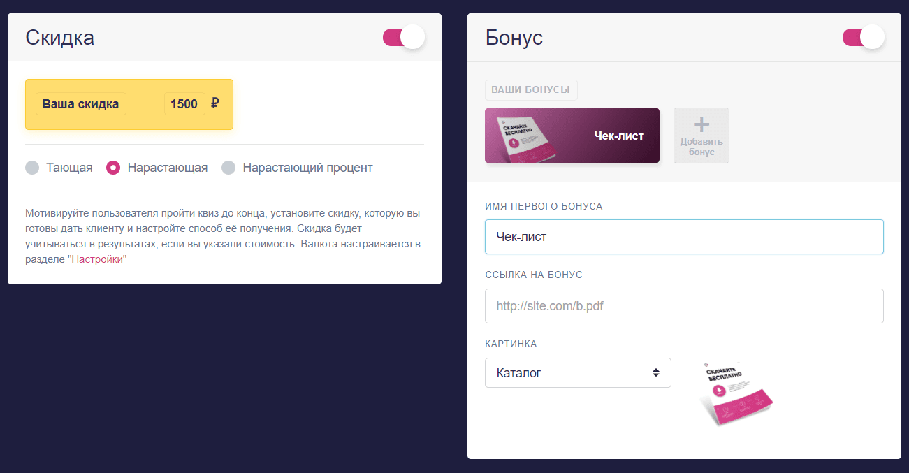 Триггеры для повышения конверсии. Чтобы замотивировать клиента пройти квиз до конца и оставить свои контакты, добавьте персональную скидку, тающую или нарастающую скидку или какой-нибудь бонус: