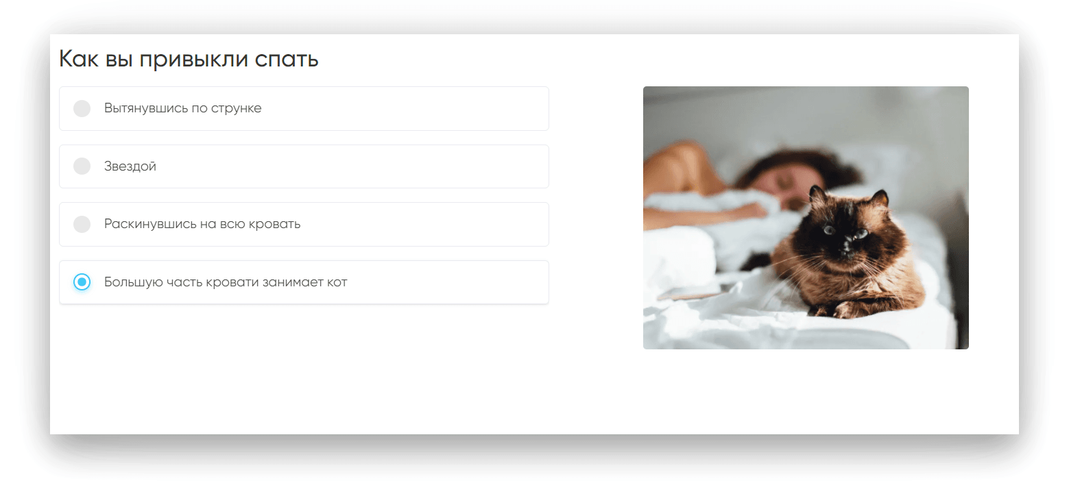 Клиент отвечает на вопросы, а в конце вы выдаете ему результат: вам подойдет кровать 160 × 220 из дуба, без изголовья. И подсказываете, какие товары могут сделать и без того отличную кровать еще лучше (матрас, подушки, одеяло).