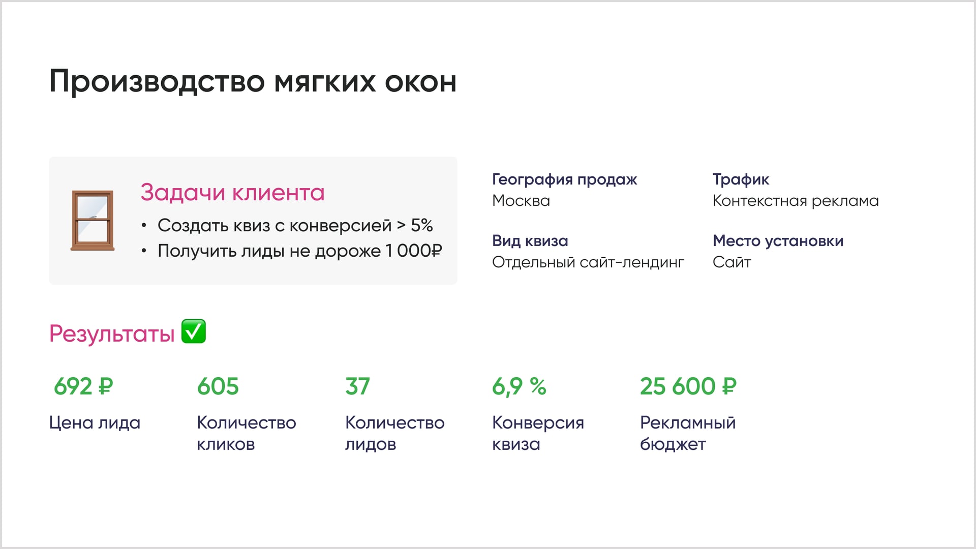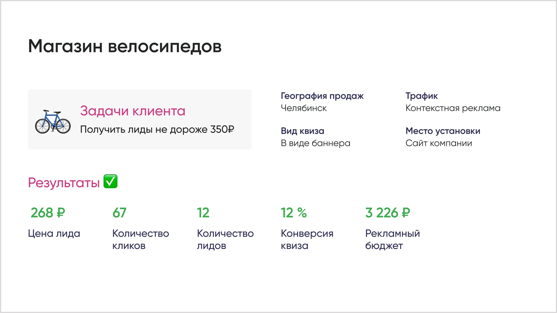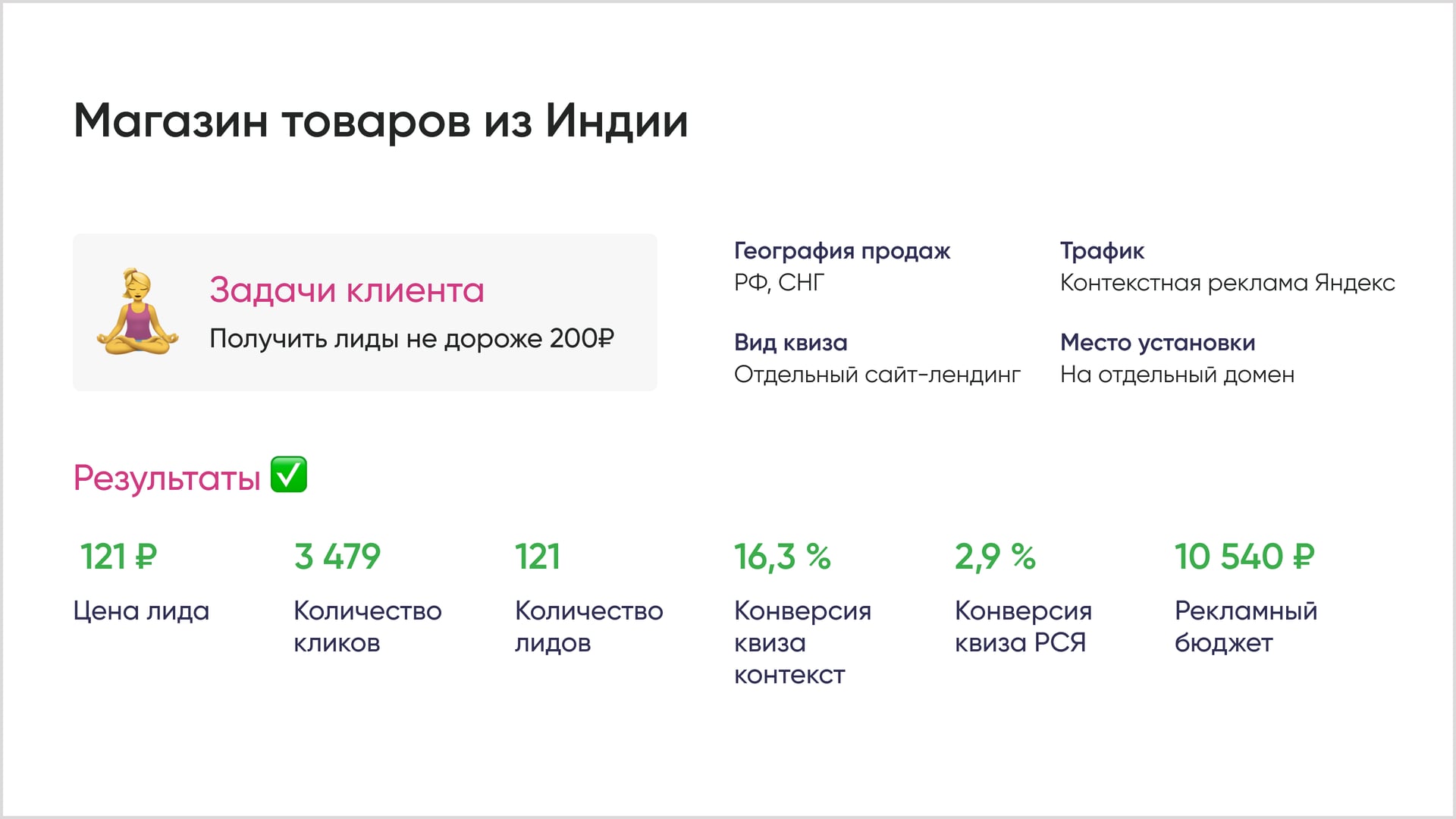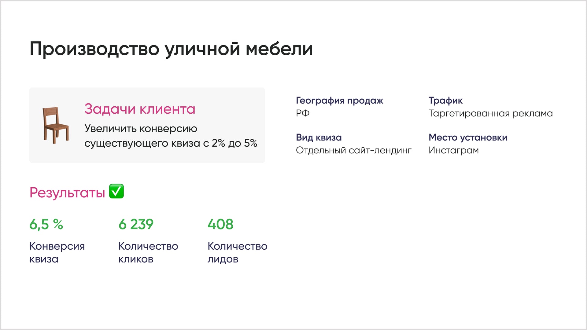 В сфере товаров хорошей считается конверсия квизов от 5%. Посмотрите, какую конверсию получили некоторые наши клиенты.