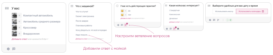 - Выбираем нужные вопросы и ответы: тип авто, общий запрос «что нужно» (мойка или сервис) и ветвление запроса (какая мойка и какой сервис), есть ли гарантия и когда готовы записаться.