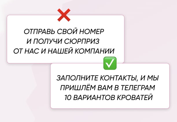 Помним, что ориентир — продажи, а не заявки. Поэтому делаем всё, чтобы у человека не было заблуждений относительного вашего оффера. Чем понятнее и чище будет ваш текст, тем лучше будет конверсия в продажу.