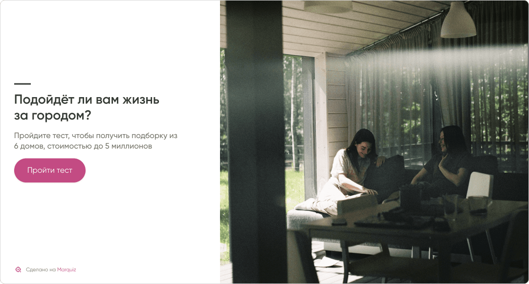 - Пройдите тест «Подойдёт ли вам жизнь за городом» и получите подборку из 6 домов, стоимостью до 5 миллионов