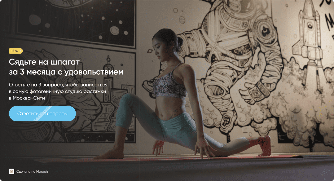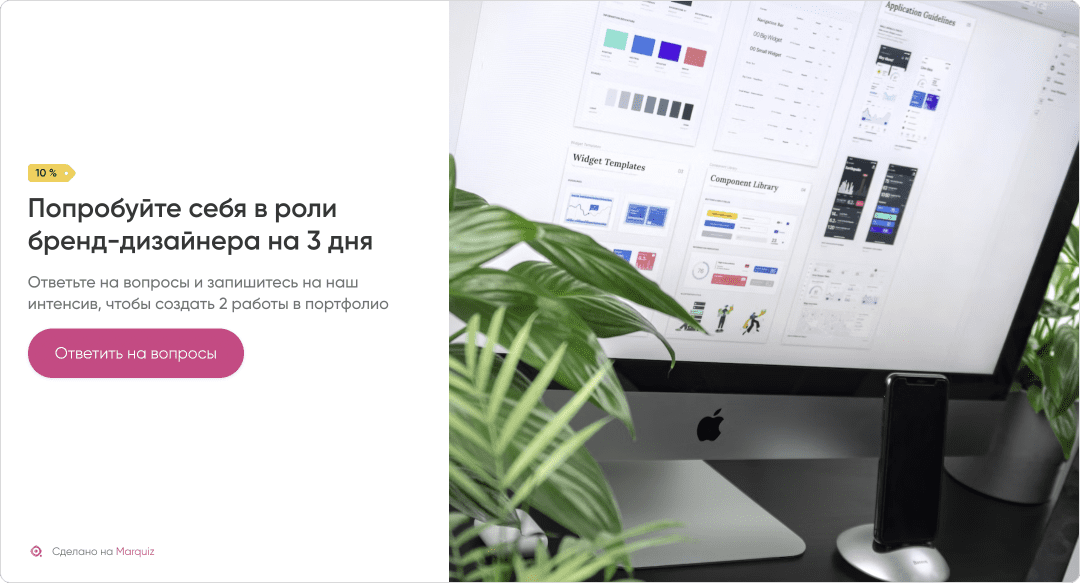 С точки зрения формата, квиз — это готовая посадочная. Стартовая страница квиза содержит оффер и призыв к действию. Этого достаточно, чтобы заинтересовать и вовлечь в прохождение. Дальше уже за прогрев будут отвечать вопросы, подсказки консультанта, бонусы и скидки и другие конверсионные фичи.