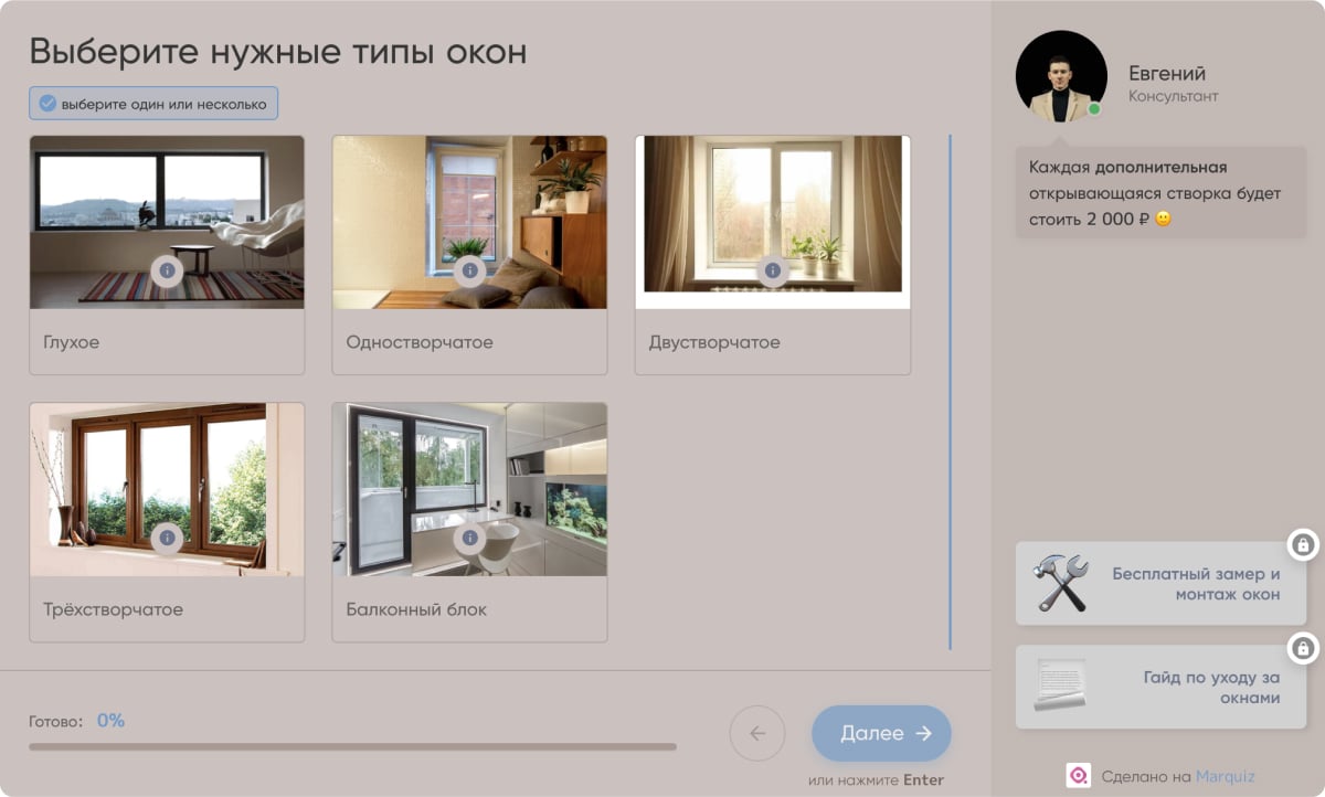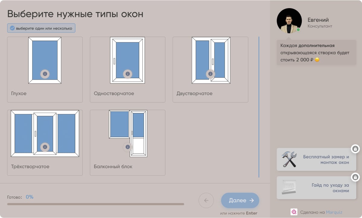 Например, предположим, мы провели A/B-тестирование квиза, который рассчитывает стоимость наших пластиковых окон. Результаты теста показали, что вариант B, на котором изображены реальные фотографии окон, оказался более привлекательным и наглядным, чем вариант A. Поэтому, чтобы увеличить конверсию, мы убрали схемы и заменили их живыми иллюстрациями из нашего каталога.